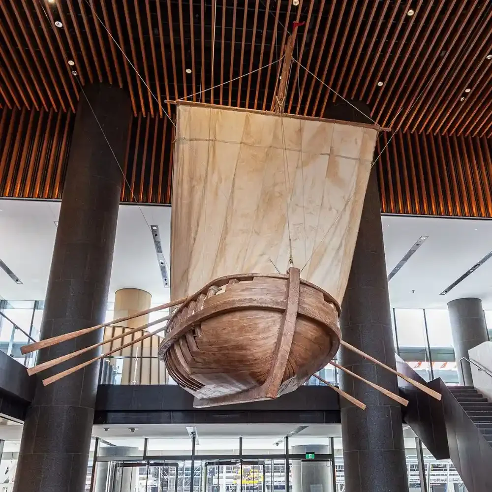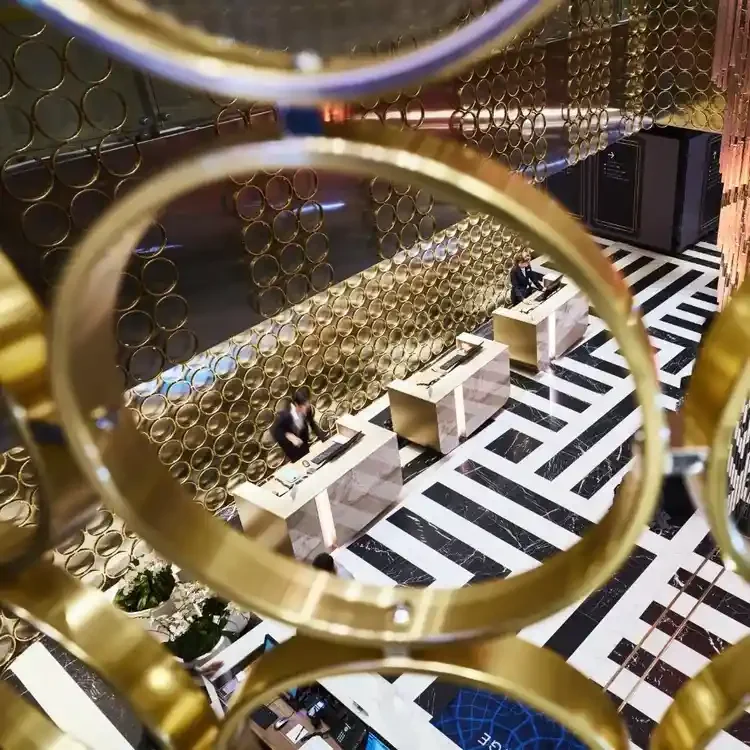 Di Emme fabricated a metal sculpture to grace the skylight. The sculpture is a series of mesh shapes punctuated by dropper lights that glow brightly at night and supplement the natural light during the day.